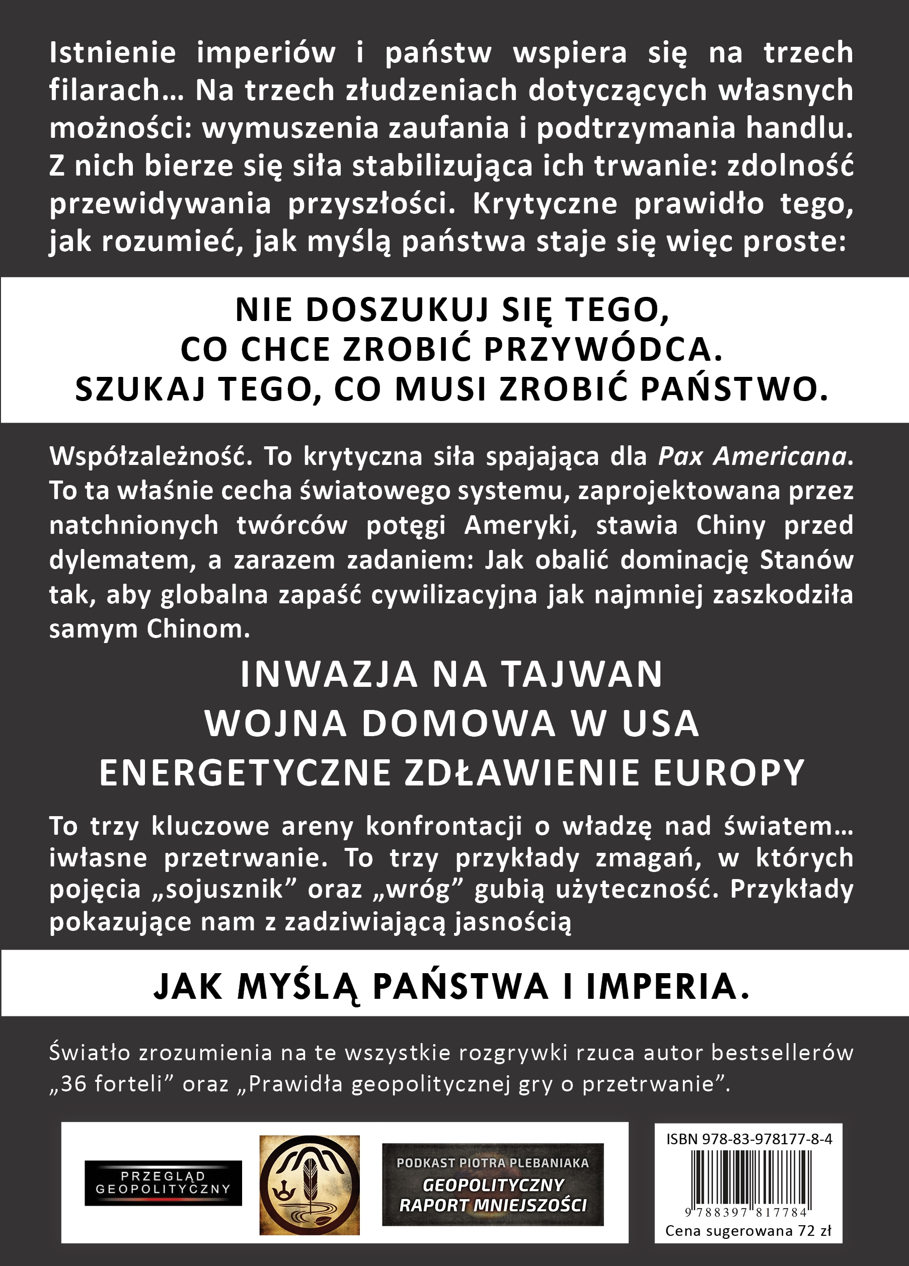 Nie doszukuj się tego, co chce zrobić przywódca. Szukaj tego, co musi zrobić państwo.Współzależność. To krytyczna siła spajająca dla Pax Americana. To ta właśnie cecha światowego systemu, zaprojektowana przez natchnionych twórców potęgi Ameryki, stawia Chiny przed dylematem, a zarazem zadaniem: Jak obalić dominację Stanów tak, aby globalna zapaść cywilizacyjna jak najmniej zaszkodziła samym Chinom. Inwazja na Tajwan Wojna domowa w USA Energetyczne zdławienie Europy To trzy kluczowe areny konfrontacji o władzę nad światem… iwłasne przetrwanie. To trzy przykłady zmagań, w których pojęcia „sojusznik” oraz „wróg” gubią użyteczność. Przykłady pokazujące nam z zadziwiającą jasnością JAK MYŚLĄ PAŃSTWA I IMPERIA. Światło zrozumienia na te wszystkie rozgrywki rzuca autor bestsellerów „36 forteli” oraz „Prawidła geopolitycznej gry o przetrwanie”.