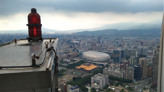 Na zdjęciu poniżej widzimy panoramę miasta Tajpej – widok z jednego z tarasów ewakuacyjnych na wysokości piętra technicznego. Panorama w kierunku północnym, ku pełnemu restauracji z owocami morza miastu Danshui (in. Tamsui). Tam też uchodzi do morza rzeka przepływająca przez miasto.